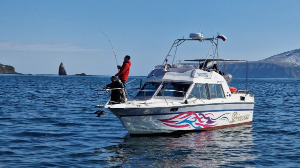 Обед (вкуснейшая уха из красной рыбы, приготовленная на борту, бутерброды, краб, свежие овощи, колбасные нарезки, конфеты, печенье, горячие напитки)